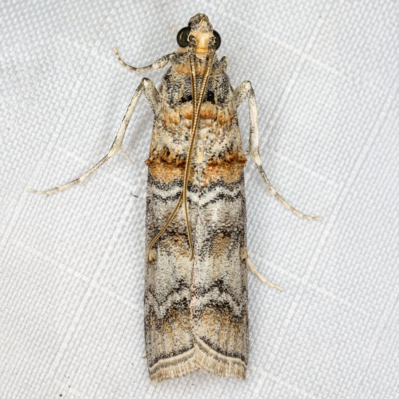 - 80a0368.2n Dioryctria argentibrunnea: Forewing antemedial white line is outwardly angled from costal margin. (Heppner 2023)