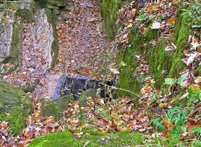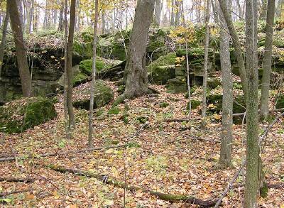 dolostone. It is surrounded by deciduous woodland, in which Sugar Maple (Acer saccharum), White Oak (Quercus alba), and White Ash (Fraxinus americana) are common trees. Non-woody plants around the cleft include Columbine (Aquilegia), Touch-me-not (Impatiens), and Clearweed (Pilea). Other cave system openings lie in exposed areas that tend to be hot, dry, and foot-beaten.