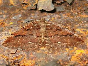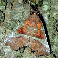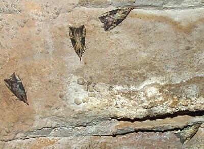Although it may seem somewhat unusual, it's not extraordinary to find moths residing in a cave. Amateur entomologist/photographer Bill Johnson of Minneapolis had photographed both Herald Moths (Scoliopterix libatrix) and Hop Vine Moths in caves in August 1998 (one of his photos is shown here, there are more below); and McKillop (1993) reported Heralds and Triphosa haesitata in Manitoba caves. Literature on Hop Vine Moths, however, appears to have focused on their damage to crops.