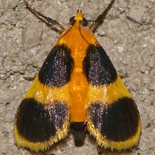 Sexually dimorphic. Males are uniformly yellow-orange except for costa of forewing narrowly margined with black on underside sometimes visible above. Females with large bluish-black patches extending beyond basal third and distal third of forewings. |