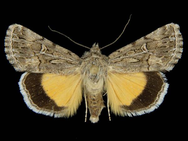 • 931862 Sympistis euta: Variable: forewing tends to be darker with less clearly defined pattern, less checkered fringe, shorter claviform; hind wing has a yellowish-orange fringe (not white) and tends to have a narrower outer black band.